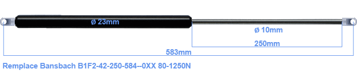 Vérin à gaz de rechange pour Bansbach B1F2-42-250-584--0XX 80-1250 Newton. L'oeillet a une épaisseur de 10mm et un trou de 8.1mm de diamètre. Marque: Hahn.