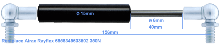 Vérin à gaz de rechange pour Airax Rayflex 6856345603502 350 Newton. Les sphères s’enclenchent sur les boules (éventuellement déjà présentes) qui ont un diamètre de 10mm. La boule correspondante est comprise dans la livraison. Marque: Hahn.