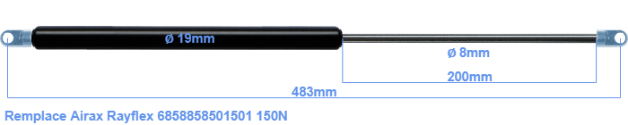 Vérin à gaz de rechange pour Airax Rayflex 6858858501501 150 Newton. L'oeillet a une épaisseur de 10mm et un trou de 8.1mm de diamètre. Marque: Hahn.