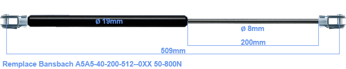 Vérin à gaz de rechange pour Bansbach A5A5-40-200-512--0XX 50-800 Newton. Le diamètre du trou de la fourche est de 8.1mm. Marque: Hahn.