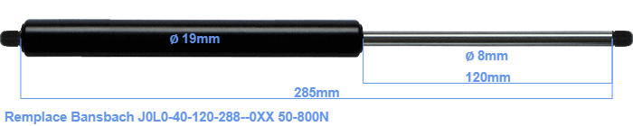 Vérin à gaz de rechange pour Bansbach J0L0-40-120-288--0XX 50-800 Newton. Filetage: M8. Marque: Hahn.