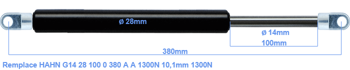 Vérin à gaz de rechange pour HAHN G14 28 100 0 380 A A 1300N 10,1mm 1300 Newton. L'oeillet a une épaisseur de 10mm et un trou de 10.1mm de diamètre. Marque: Hahn.
