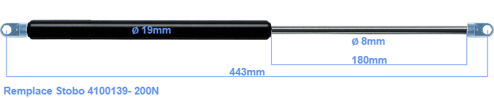 Vérin à gaz de rechange pour Stobo 4100139- 200 Newton. L'oeillet a une épaisseur de 10mm et un trou de 8.1mm de diamètre. Marque: Hahn.